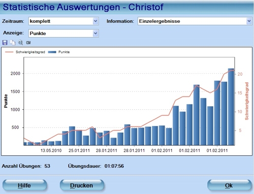 Die Werte unterhalb der Grafik geben an, wie oft und wie lange Sie mit einer Übung gearbeitet haben.