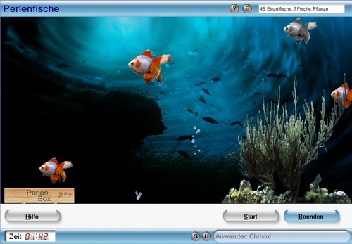 Ist ein Fisch auf der anderen Seite des Bildschirms oberhalb der Perlenbox angekommen, klicken Sie ihn an, falls er eine Perle trägt. Dann lässt er die Perle fallen. Fällt die Perle in die Perlenbox, erhalten Sie Pluspunkte.