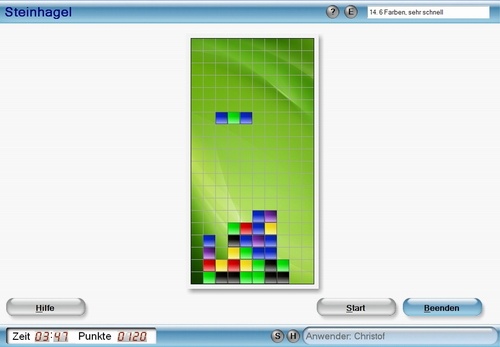 Auf das Spielfeld regnet es mehrfarbige Steine. Durch geschickte Steuerung der Steine sollen sie zur Explosion gebracht und so ein "Überlaufen" des Spielfelds verhindert werden. Gelingt es Ihnen, die herabfallenden Steine so mit der Tastatur zu steuern,  dass 3-er Reihen von gleichfarbigen Steinen entstehen (senkrecht, waagrecht oder diagonal), explodieren die Steine und die darüber liegenden rutschen entsprechend tiefer. Das schafft wieder Platz auf dem Spielfeld, ein Überlaufen wird verhindert und Sie werden dafür mit Punkten belohnt.