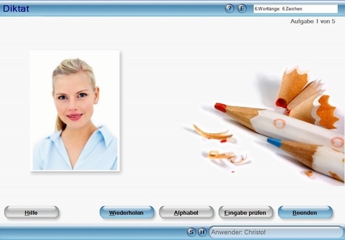 Die junge Dame diktiert Ihnen mit Hilfe des Buchstabieralphabets Wörter, die Sie anschließend wiedergeben sollen.