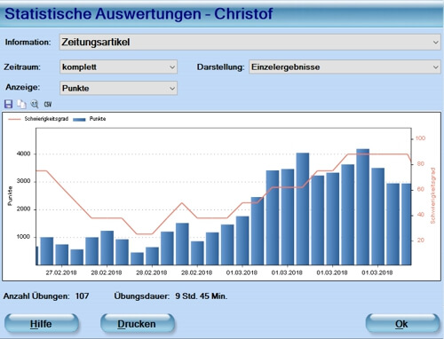 Die Werte unterhalb der Grafik geben an, wie oft und wie lange Sie mit einer Übung gearbeitet haben.