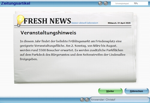 Im ersten Schritt zeigt Ihnen das Programm einen Text. Diesen prägen Sie sich gut wie möglich ein. Anschließend stellt Ihnen Fresh Minder Fragen zu den Inhalten.